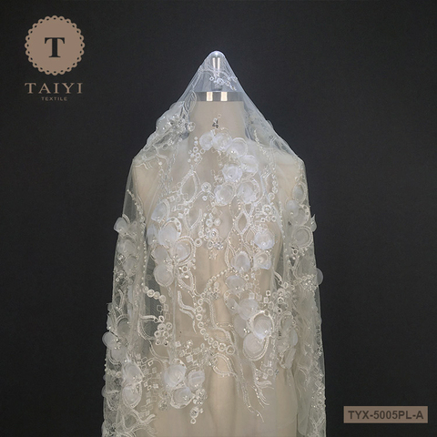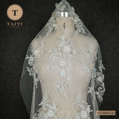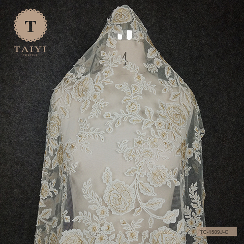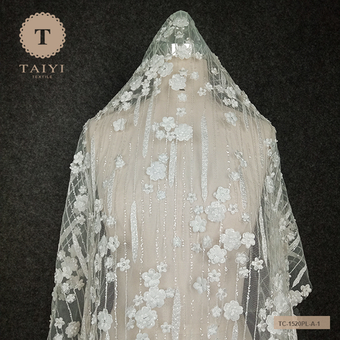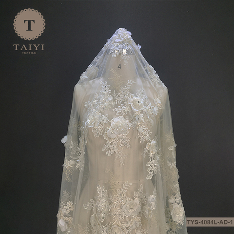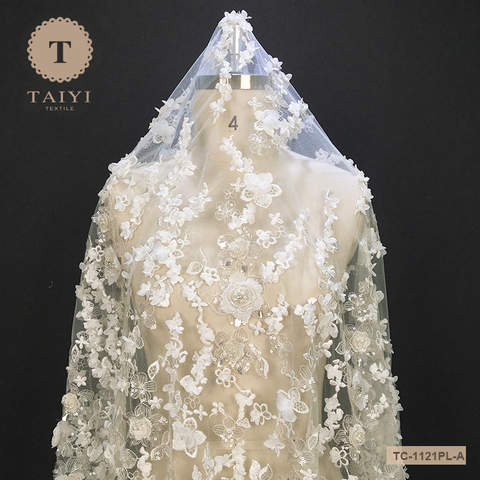 Top End Francese Bianco di Tulle Del Merletto Del Tessuto, 3D Fiore Del Ricamo Netto Pizzo Con Perle Per La Cerimonia Nuziale Abito Da Sposa